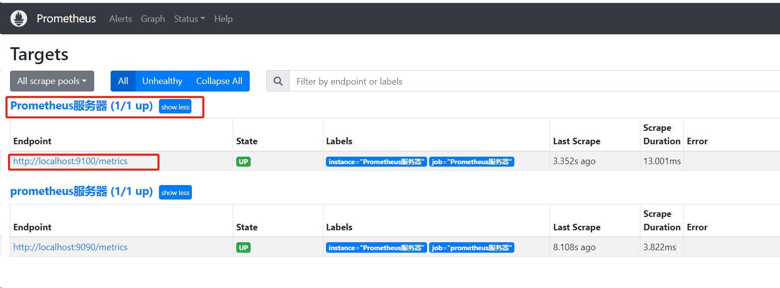 bash#重启 systemctl restart prometheus.service #重载:前提是在prometheus.service启动服务项中加了--web.enable-lifecycle参数 ###--web.enable-lifecycle:###启用Prometheus的生命周期接口,允许通过HTTP请求来动态重新加载配置等操作。这对于在运行时更新配置或执行其他管理操作非常有用,当修改了prometheus的配置后,可以通过curl命令来重新加载配置文件,而不需要重启prometheus。 curl -X POST http://localhost:9090/-/reload3)在prometheus查看是否可以看到监控信息