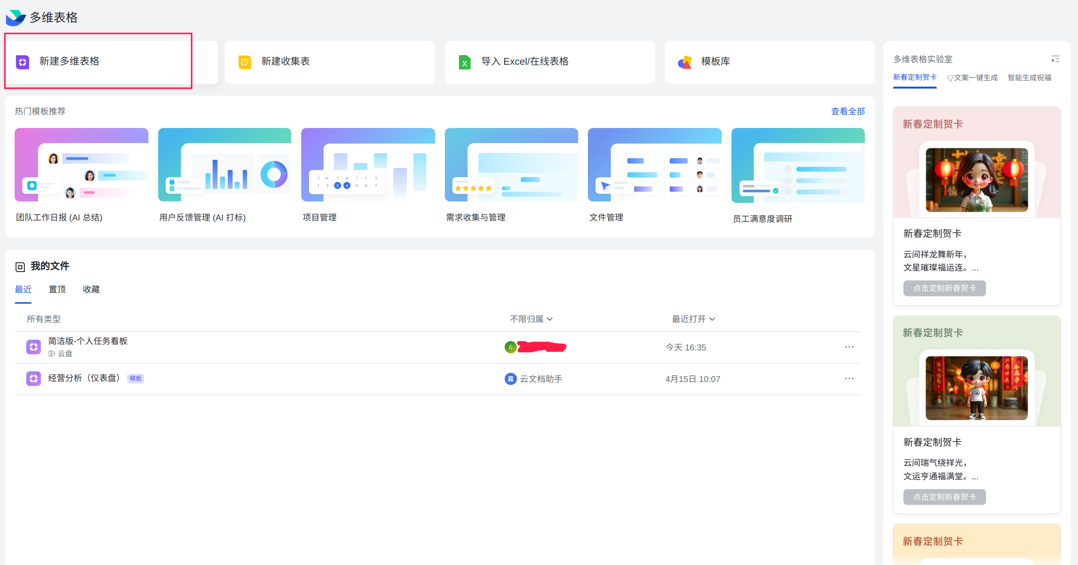 浏览器打开飞书网页飞书,AI 时代先进生产力平台,提供一站式工作协同、组织管理、业务提效工具和深入企业场景的 AI 能力,助力企业能增长,有巧降,找到多维表格点击打开,选择新建多维表格