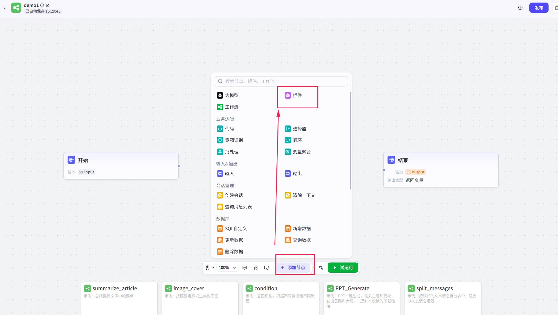 接下来我们添加一个新的节点,利用头条的插件来获取头条数据信息。具体操作为:点击"添加节点",选择插件,搜索框搜头条,选择头条新闻插件点击添加即可。