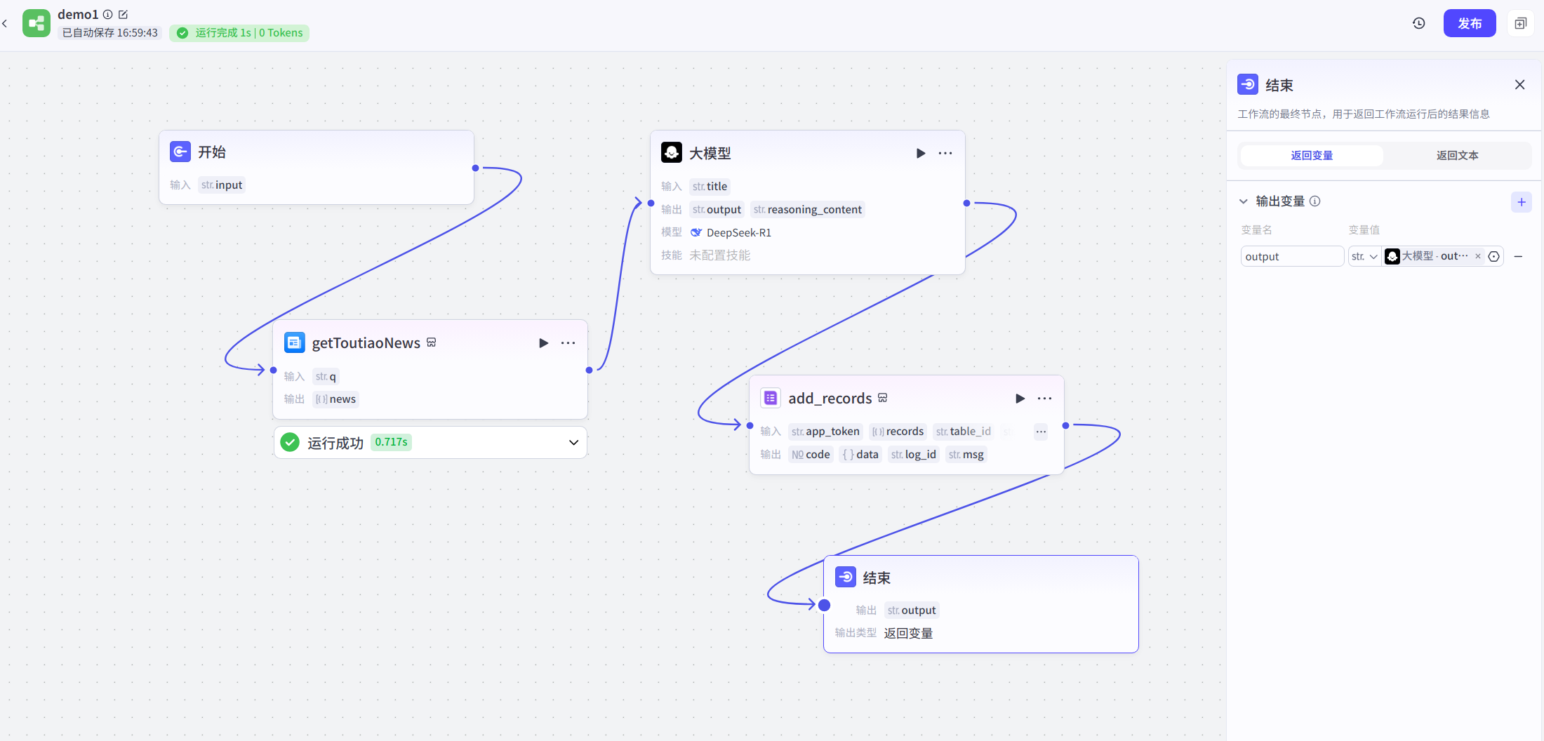 最后一个结束模块的output变量同样选择大模型的output。
