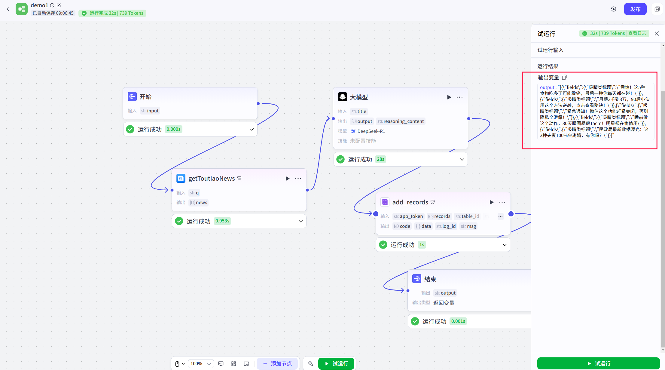 可以看到,工作流的输出结果均为与关键字相关的新闻标题,且该数据同步录入到了我们配置好的飞书多维表格中。