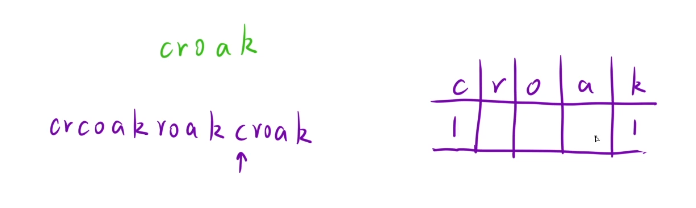 我们在哈希表中计数,假设我们的数组是上面这样的,我们从c开始统计,c的个数+1,遍历到r,判断r前面是否出现c,我们将1移动到我们的r的位置,然后遍历到c的位置,就说明又出现了一只青蛙,那么我们在c的位置再次加上1,遍历到o,我们判断前面是否出现r,哈希表中出现了,那么我们将r位置上的1移动到o了,然后遍历到a的位置,我们判断前面是否出现o,出现了,我们将o的位置上的1移动到a的位置,那么遍历到k,前面出现了a,那么我们将1移动到k的位置,那么现在我们的1只青蛙就完成了呱叫,但是此时我们的c位置上还有一个数据,就说明还有1只青蛙,我们再次进行相同的步骤,到这里我们的两只青蛙都完成了呱,但是后面还有一个croak,那么此时我们将这两只青蛙其中一只拿去遍历,看看是否能完成呱叫,最少出现了两只青蛙了
