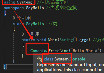 像Console.WriteLine是隶属于System的,只有using System引入了命名空间才能用