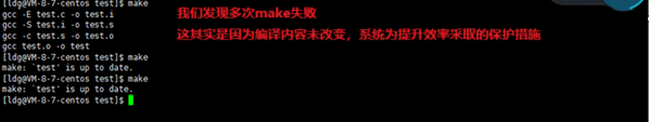 之后可多次make,但是.PHONY+test意义不大,基b于历史源文件编译通常不尽人意,会强制程序员删除源代码,又因为clean中可添加其他可执行程序,因此建议PHONY+clean