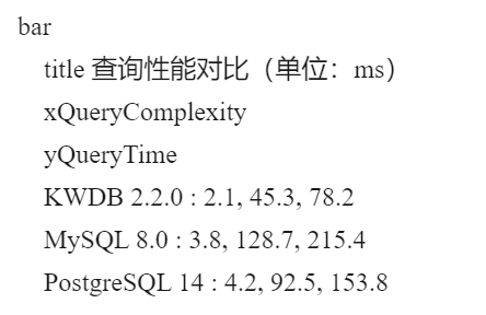 该图展示了KWDB 2.2.0、MySQL 8.0和PostgreSQL 14在不同查询复杂度下的响应时间对比。KWDB在简单点查、多表关联和聚合分析等场景中均表现优于其他数据库。