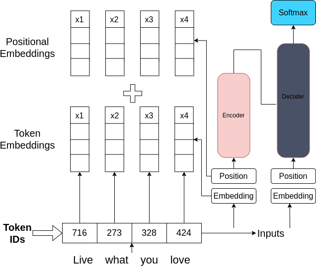 - Token IDs:文本首先要进行分词处理,将文本中的单词或子词转换为对应的数字标识,即Token IDs 。图中"Live what you love"这句话被转换成了716、273、328、424这样的数字,这些数字代表了词汇表中相应单词或子词的索引。