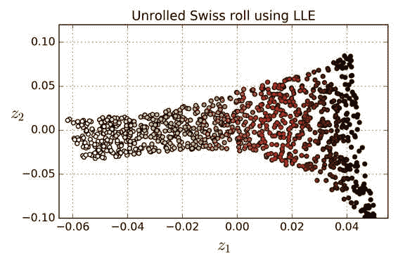 如图,瑞士卷被完全展开,实例之间的距离保存得很好。但是,距离不能在较大范围内保留的很好:展开的瑞士卷的左侧被挤压,而右侧的部分被拉长。尽管如此,LLE 在对流形建模方面做得非常好。