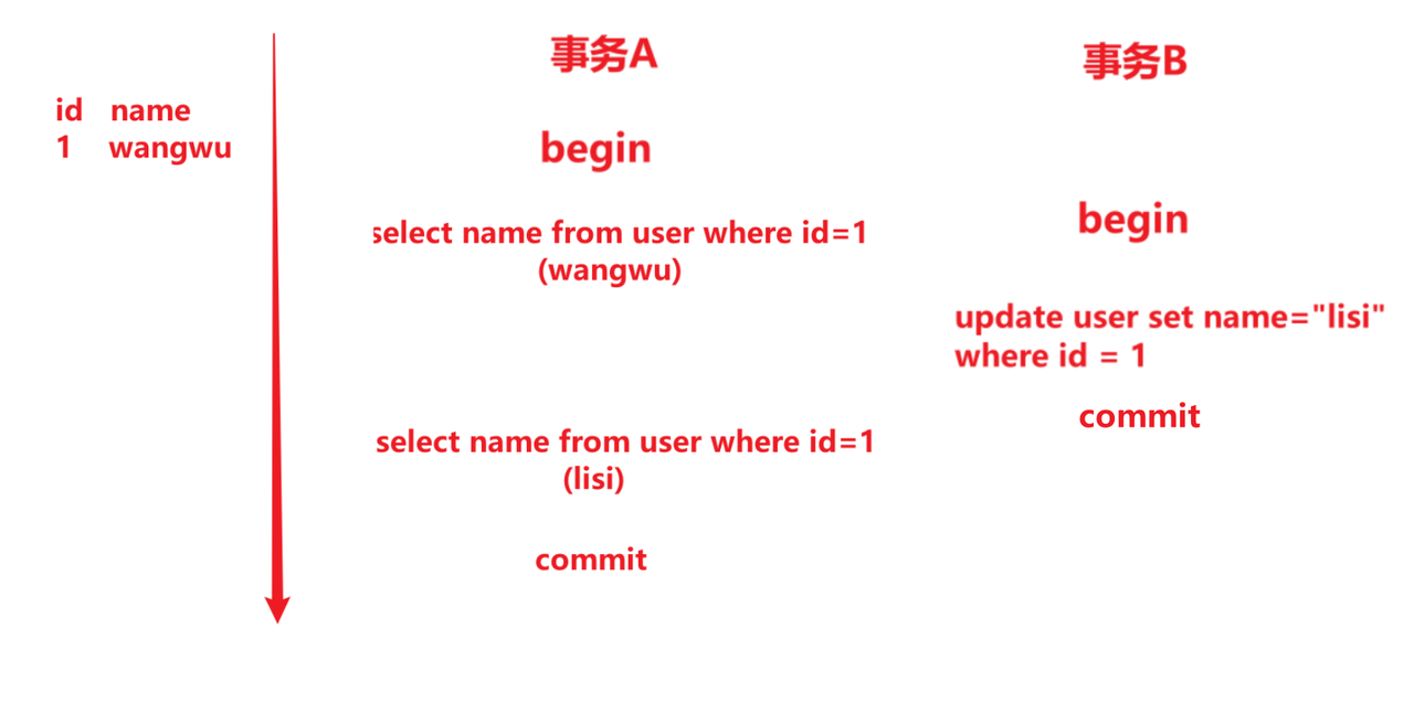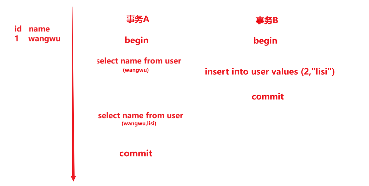 例如:事务A读取name字段为"wangwu",但是事务B修改为"lisi"并且提交,事务A第二次读取name字段为"lisi"。则事务A的第二次读取发生了不可重复读。