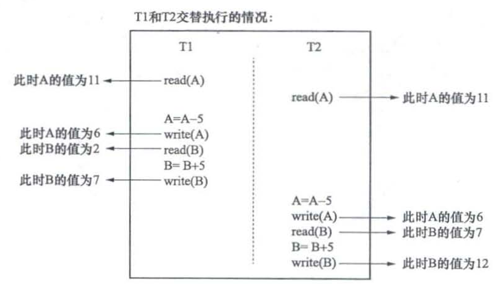 - 图中有两个事务,为T1、T2。T1中的张三扣钱操作执行钱,T2就先把张三钱的数额读出来了。最终导致,张三只扣了5块钱,而李四却增加了10块钱。最正确的应该是T1读了A,那么此时T2就不能读这个值。