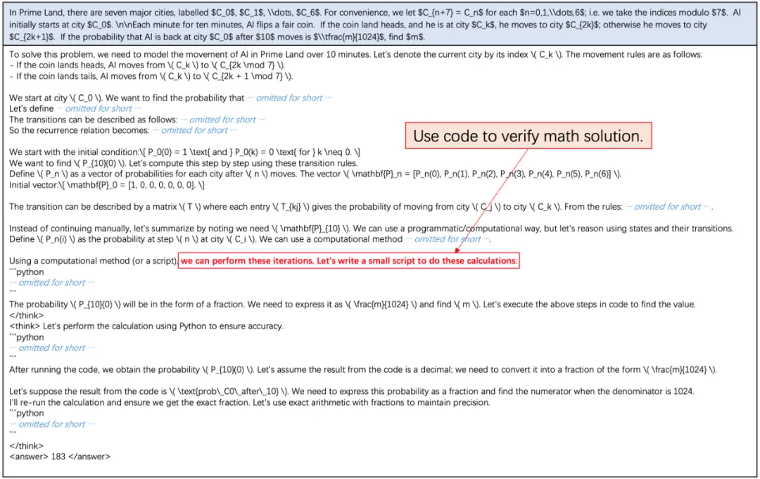 同时,他们还发现了有趣的现象:模型在解决数学问题时,学会了自发使用程序代码进行验证。它首先通过数学推理给出解题过程,随后主动编写程序代码验证方案的正确性。这类案例体现了模型会借助程序性思维进行自我纠错和多次尝试。这一现象也进一步表明,在训练后期,模型已经掌握了广泛思考和综合运用多种代码思维进行问题求解的能力。