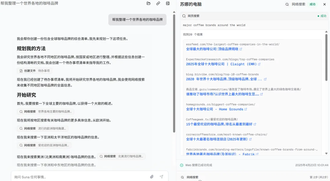 然后,Suna 根据待办事项,使用网络搜索来收集不同地区咖啡品牌的全面信息,期间它会搜索各种网页内容。