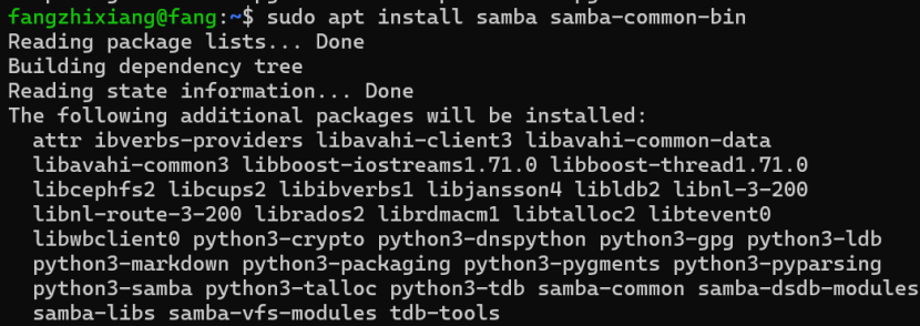 安装完成后,Samba 服务(smbd 和 nmbd)会自动启动