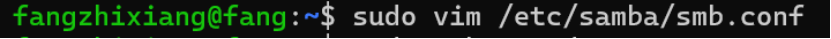 非常重要!!! path的路径是自己用户所在路径下的Share目录,这里的fangzhixiang是我的用户名 ,包括下面valid users ,也是要用自己的用户名