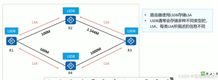 每台路由器都会产生 LSA,路由器将接收到的 LSA 放入自己的 LSDB (Link state DataBase,链路状态数据库)。路由器通过对 LSDB 中所存储的 LSA 进行解析,进而了解全网拓扑。
