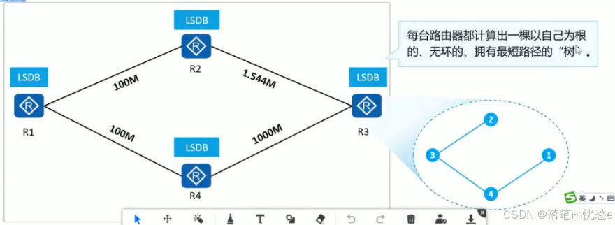 每台路由器基于 LSDB,使用 SPF (Shortest Path First,最短路径优先)算法进行计算。每台路由器都计算出一棵以自己为根的、无环的、拥有最短路径的"树"。有了这棵"树",路由器就已经知道了到达所有网段的优选路径。