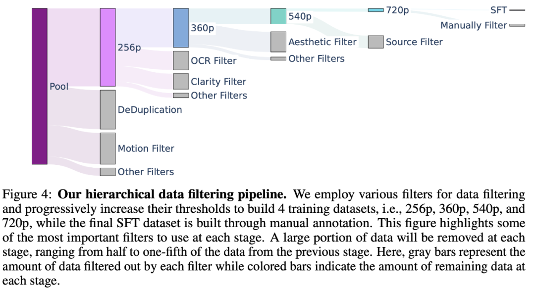 数据筛选。使用PySceneDetect将原始视频切分为视频片段,使用VideoCLIP模型计算这些视频片段的embeddings,根据embeddings过滤掉相似度高的视频片段和重采样。定义了一系列过滤器用于过滤数据,包括:美学过滤器,光流过滤器,OCR过滤器,运动过滤器等,用于筛选出美学质量高,高动态性,清晰,不包括文本和字幕的视频片段。数据过滤pipeline如下所示,总共产生了5个数据集,对应着5个训练阶段,同时视频分辨率也在逐步增加。为了在最后一个阶段提升模型性能,论文构建了一个包括1M高质量视频片段的数据集,用于微调模型。