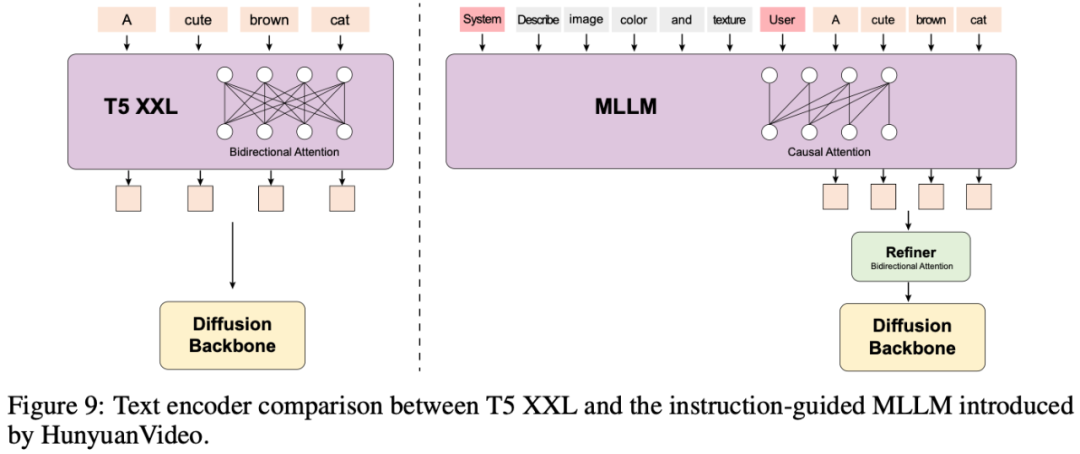 Large Language Models。prompt输入text encoder得到prompt embeddings。HunyuanVideo使用了一个预训练好的多模态大语言模型(MLLM) Llama作为text encoder,这种设计具有如下优势:(1)与T5相比,MLLM经过visual instruction finetuning后其特征空间中的图像-文本对齐更好,(2)与CLIP相比,MLLM具有更好的图像细节描述和复杂推理能力,(3)MLLM可以作为一个zero-shot learner,通过跟随用户提供的prompt,帮助文本特征更多地关注关键信息。T5-XXL使用的是bidirectional attention,MLLM使用的是causal attention,后者可以为扩散模型提供更好的文本引导。为此,HunyuanVideo引入了一个额外的bidirectional token refiner来增强文本特征。同时使用CLIP模型提取包含全局信息的pooled prompt embeddings,随后加到timestep embedding中输入到网络中。