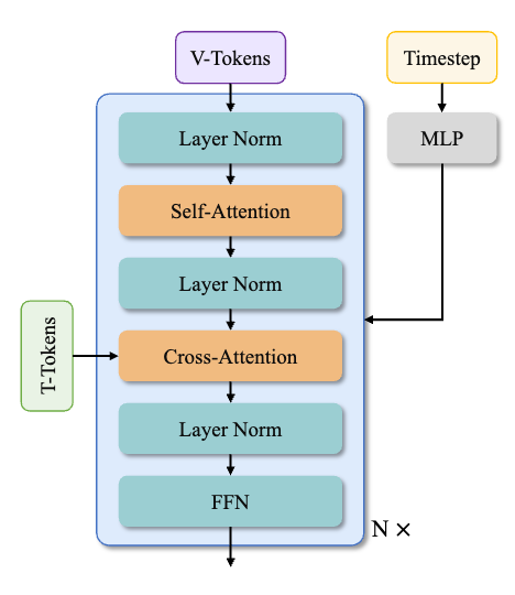 Causal 3D VAE。首先Causal 3D VAE encoder将视频和图像从pixel空间压缩到latents空间。具体来说,使用CausalConv3D将形状为 的视频数据压缩为 的latents,其中。经过VAE压缩后的视频latents形状为 ,使用卷积核为 3D convolution对视频latents进行处理,随后展平为1D向量,就得到了长度为的1维tokens。