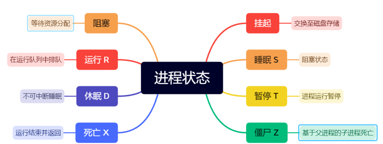 挂起状态通常发生在内存不足时,操作系统将进程的状态保存在磁盘上,以便稍后恢复。挂起进程不会占用内存和 CPU 资源。