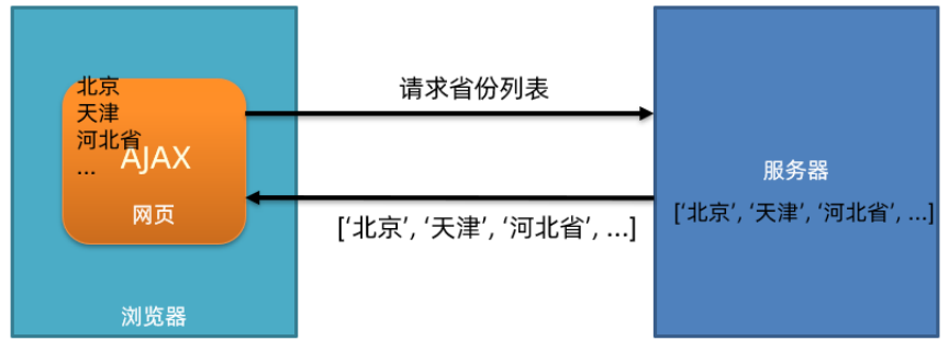XMLHttpRequest对象与服务器通信。 - 在浏览器网页中,通过 AJAX 技术(XHR 对象)发起获取省份列表数据的请求,服务器返回准备好的省份列表数据给前端,前端将数据展示到网页。