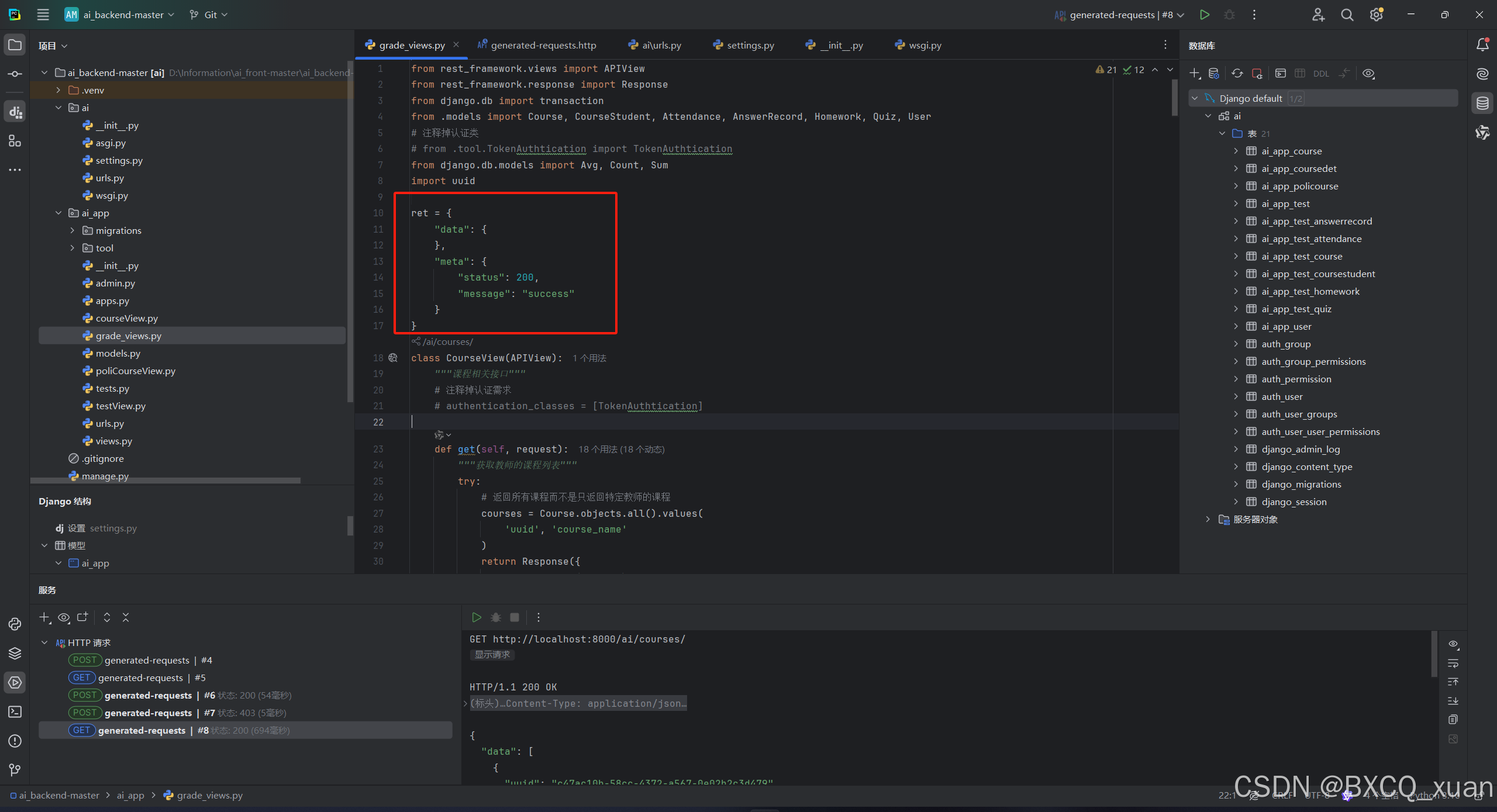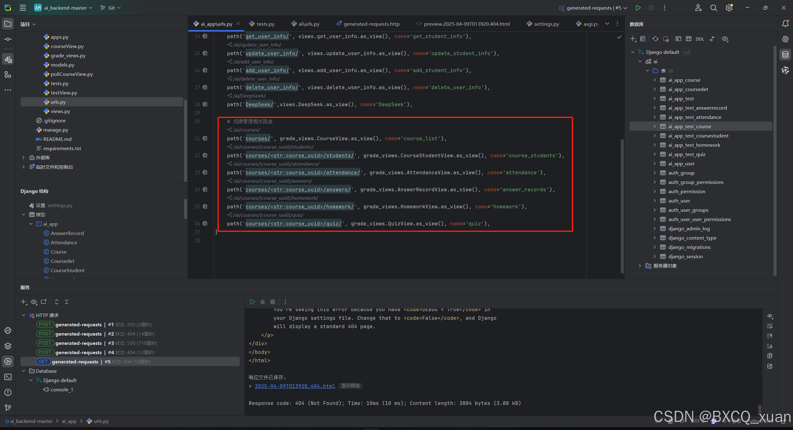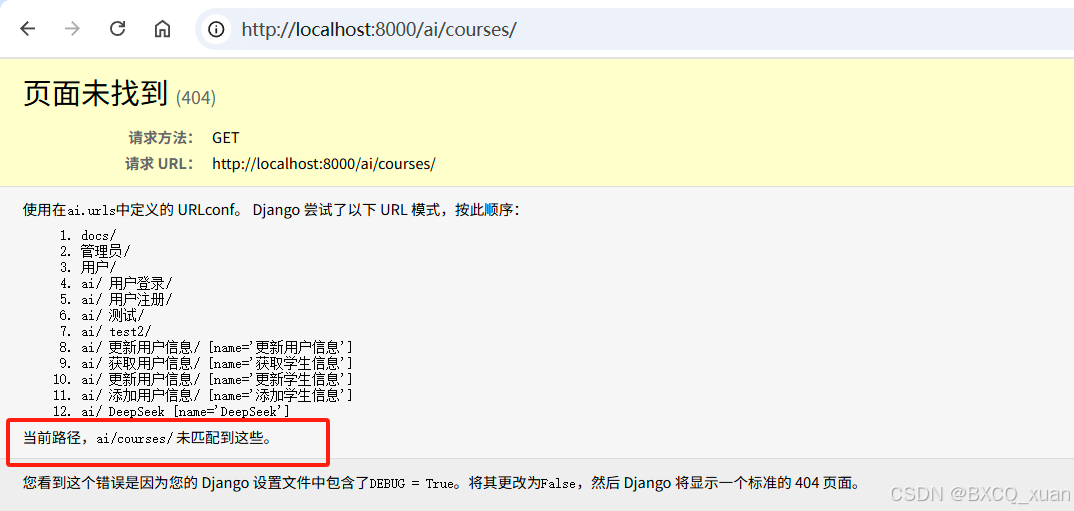 前几天参与了一个AI+智慧教学项目,前端vue后端用Django。在开发 API 接口时遇到了一个令我困惑的问题:明明已经正确实现了 API 的逻辑,但是前端没有接收到数据,所以我使用了在HTTP客户端生成请求:GET http://localhost:8000/ai/courses/ ,结果返回了一个404页面,没有这个路径!然后搜了一天也没解决,最后我观察了一下项目原有的视图文件,发现少了一个前台返回格式 。