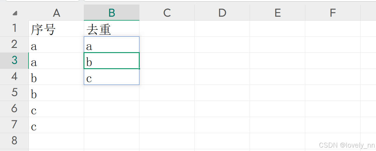 如下要对"序号"这列的内容去重输入UNIQUE函数,选择"序列"这列内容即可: