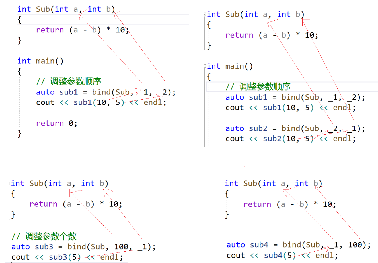 - bind 是⼀个函数模板,它也是⼀个可调⽤对象的包装器,可以把他看做⼀个函数适配器,对接收的fn可调⽤对象进⾏处理后返回⼀个可调⽤对象。 bind 可以⽤来调整参数个数和参数顺序。