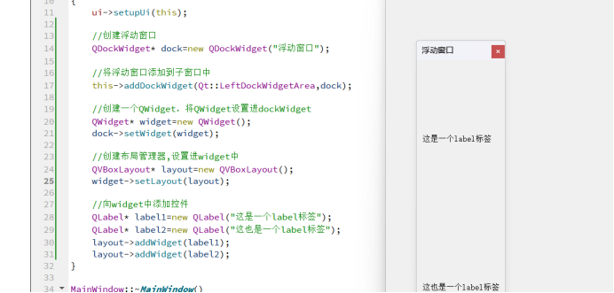 通过addDockWidget将浮动窗口添加到当前窗口内,第一个参数为添加到当前窗口的位置