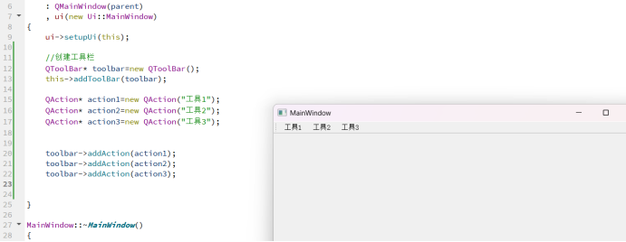 添加工具栏使用的是addToolbar,而不是set,而菜单栏的添加使用的是setMenubar,因为菜单栏只能有一个,而工具栏可以有多个