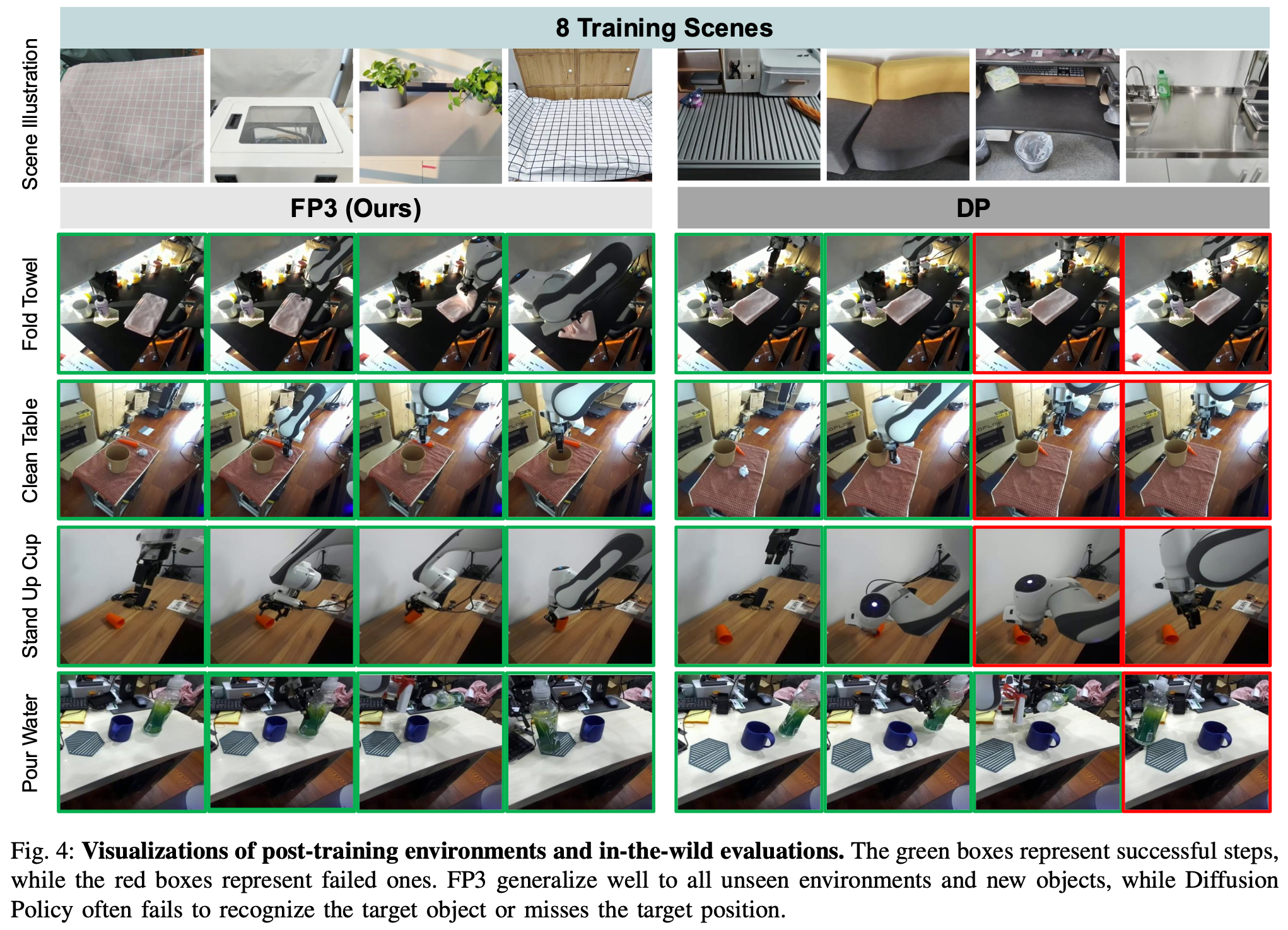 首先评估 FP3 高效学习新任务的能力。为 8 对环境-对象对采集 10 个演示,从而为每个任务获得总共 80 个演示。对于 DP 和 DP3 使用这些演示来训练策略;OpenVLA 和 FP3 对每个任务的基础模型进行微调。从头开始训练 FP3 以验证预训练的必要性。
