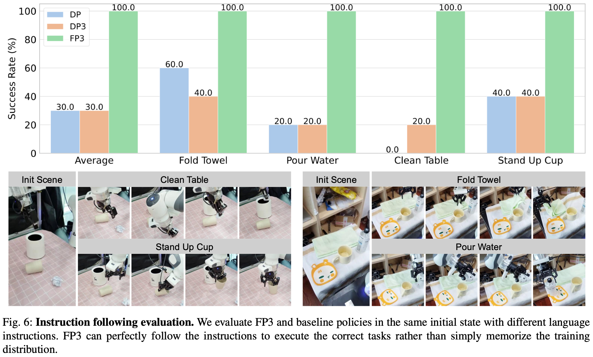 FP3对未见过的物体和场景的泛化效果如何; FP3对环境扰动(例如光照、摄像机视角、干扰因素等)的鲁棒性如何;FP3能否按照语言指令正确执行相应的任务;