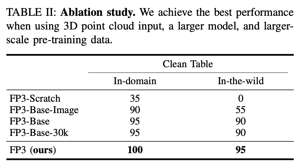 Table.2展示了各变体在清洁桌面任务上的结果。FP3-Scratch 在领域内和实际环境中均表现不佳,这表明预训练的重要性;FP3-Base-Image 在领域内的性能与 FP3-Base 相当,但在实际环境中性能下降幅度巨大,凸显了 3D 点云表示的有效性;FP3-Base 和 FP3-Base-30k 表现出相似的性能,均低于完整的 FP3。为了得出关于预训练精确缩放规律的更明确的结论,可能需要更具挑战性的任务和额外的数据点。