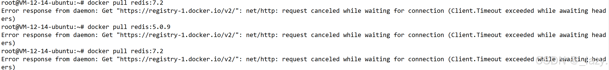 不过这里我们会面临一个问题就是被墙,这是国内服务器(像腾讯云、阿里云、华为云)常见的现象 ,因为访问 Docker Hub 会被墙或受限,导致连接慢、超时、甚至失败。报错信息常见为: