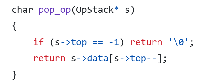 如果栈不为空,这行代码将栈顶指针减 1(s->top--),并返回原来栈顶位置的运算符(s->data[s->top])。