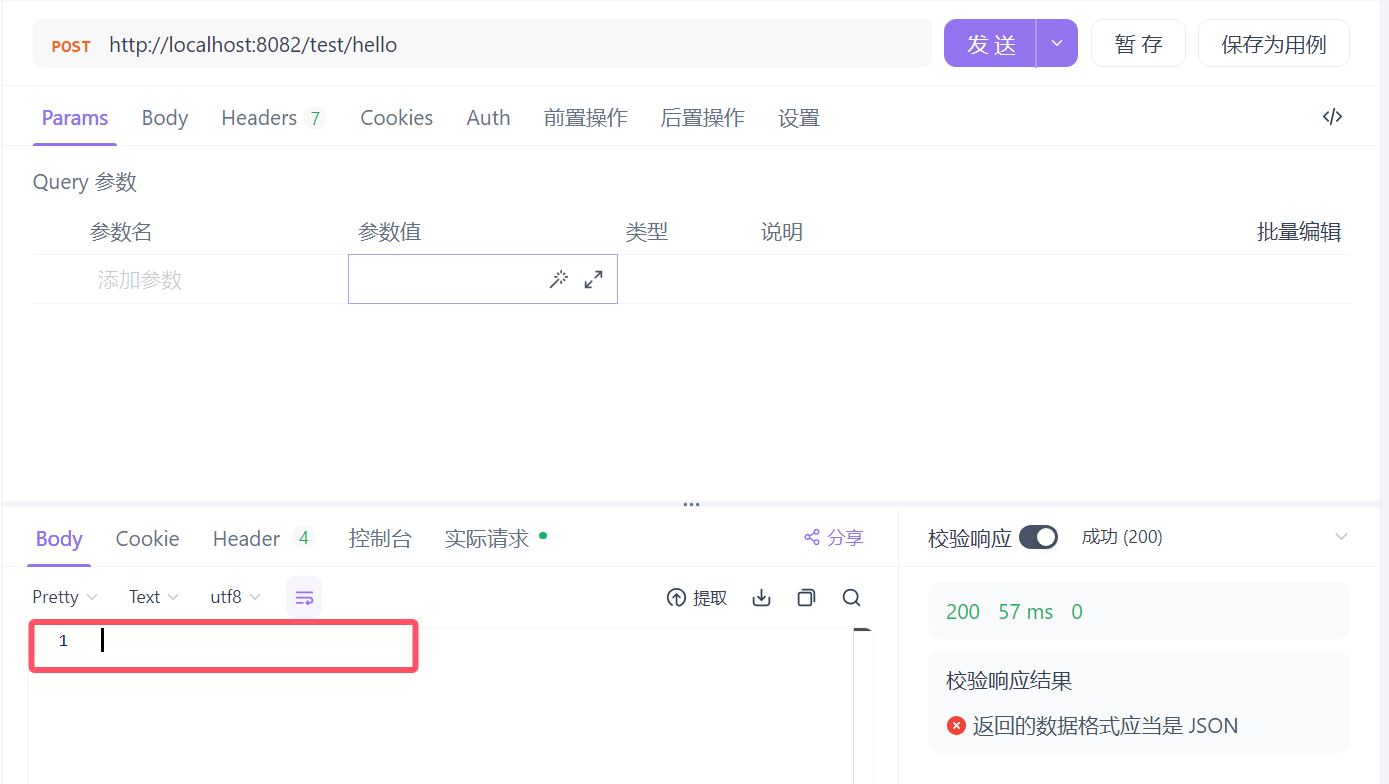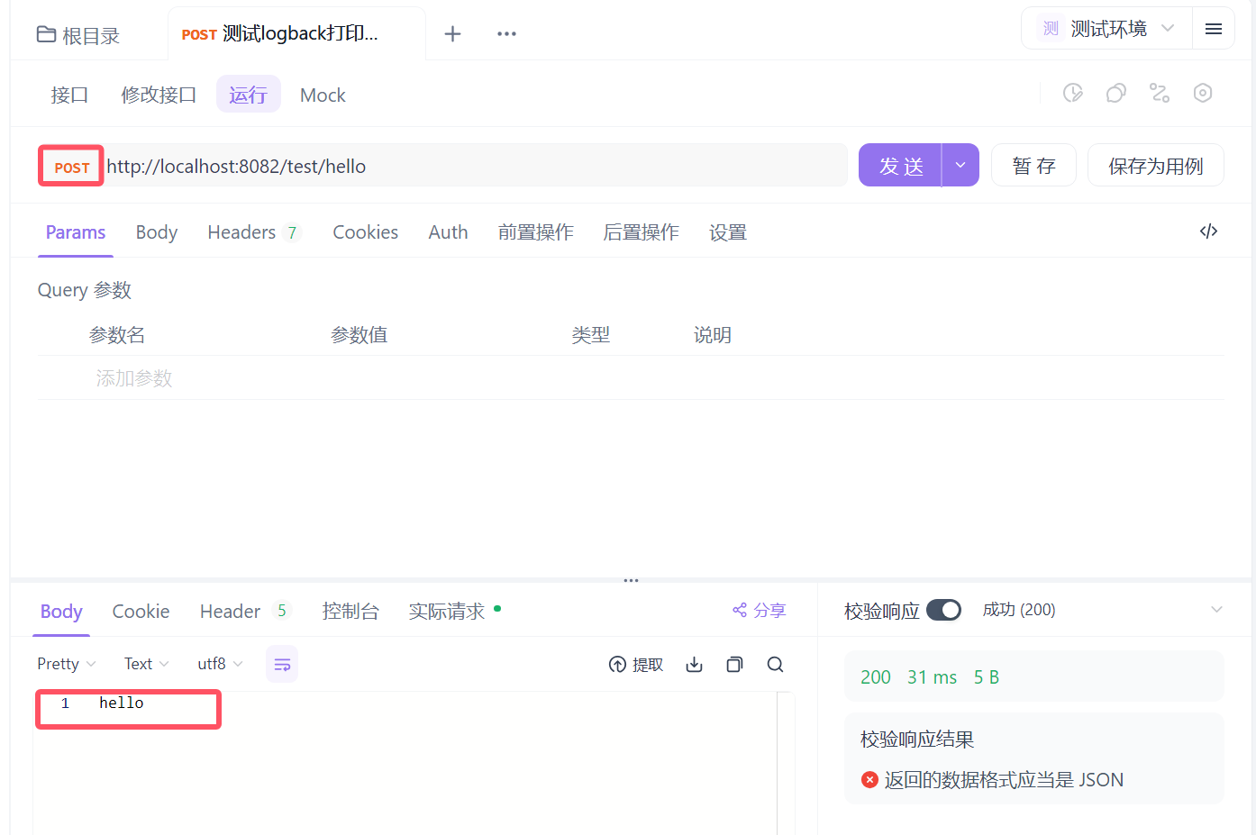 javaimport com.minyudie.spring_boot_basic1.pojo.Datasource; import org.slf4j.Logger; import org.slf4j.LoggerFactory; import org.springframework.beans.factory.annotation.Autowired; import org.springframework.web.bind.annotation.PostMapping; import org.springframework.web.bind.annotation.RequestMapping; import org.springframework.web.bind.annotation.RestController; @RestController @RequestMapping("/test") public class TestController { @Autowired private Datasource datasource; private static final Logger logger =LoggerFactory.getLogger(TestController.class); @PostMapping("/hello") public String hello() { logger.info("I'm logger"); return "hello"; } }使用apifox测试网址,使用post方法访问: