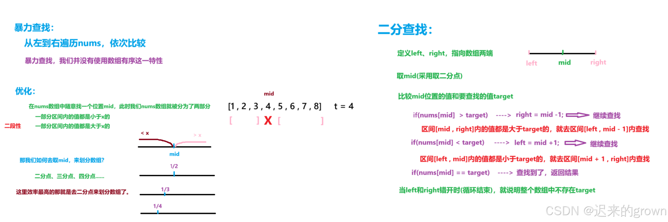 那我们大致就理解了如何去找target;但是我们可以取二分点也可以取三分点、四分点...,那如何去取mid呢?