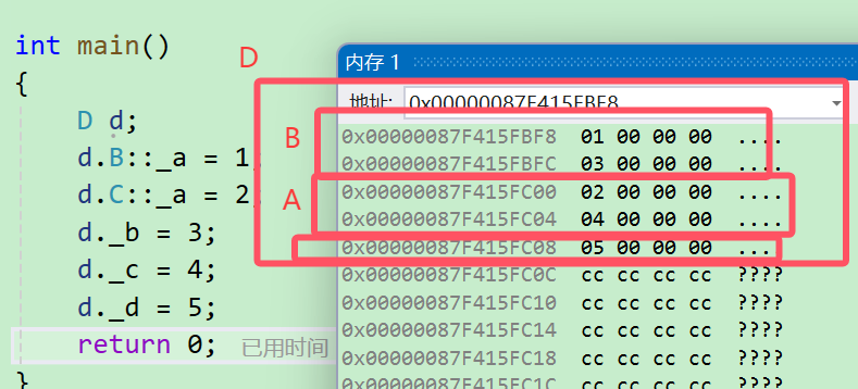 为了研究虚拟继承原理,我们给出了一个简化的菱形继承继承体系,再借助内存窗口观察对象成 员的模型。
