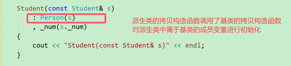 - 派生类的拷贝构造函数必须调用基类的拷贝构造完成基类的拷贝初始化。