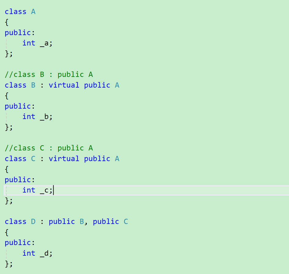 虚拟继承的使用格式是在继承方式前面加上 关键字 " virtual "