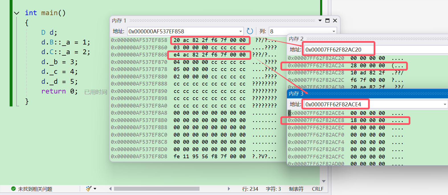 根据窗口显示,可以推测偏移量是用 int 存储的,虚基表的第一个位置是不存储有效数据的,从下一个位置存储偏移量。