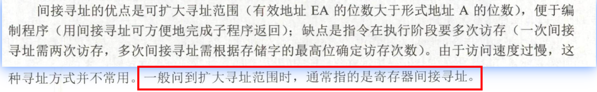 3.直接寻址的优点是简单,指令在执行阶段仅访问一次主存,不需要专门的计算操作数的地址,缺点是A的位数决定了该指令操作数的寻址范围,操作数的地址不易改变。