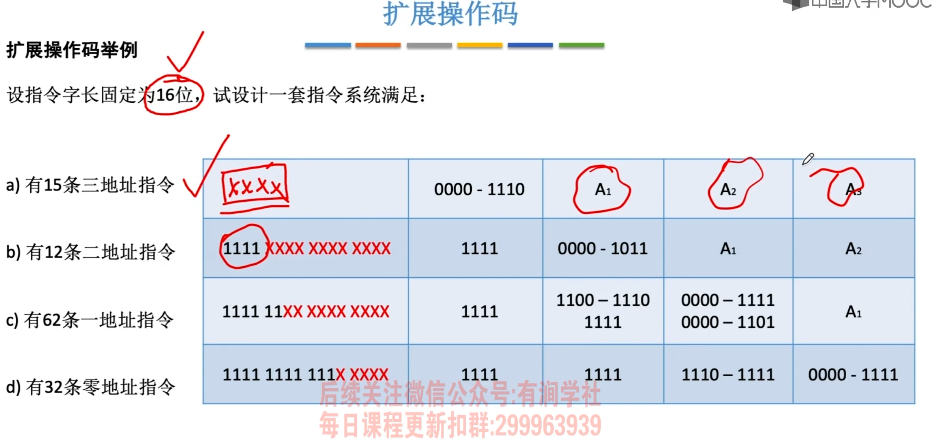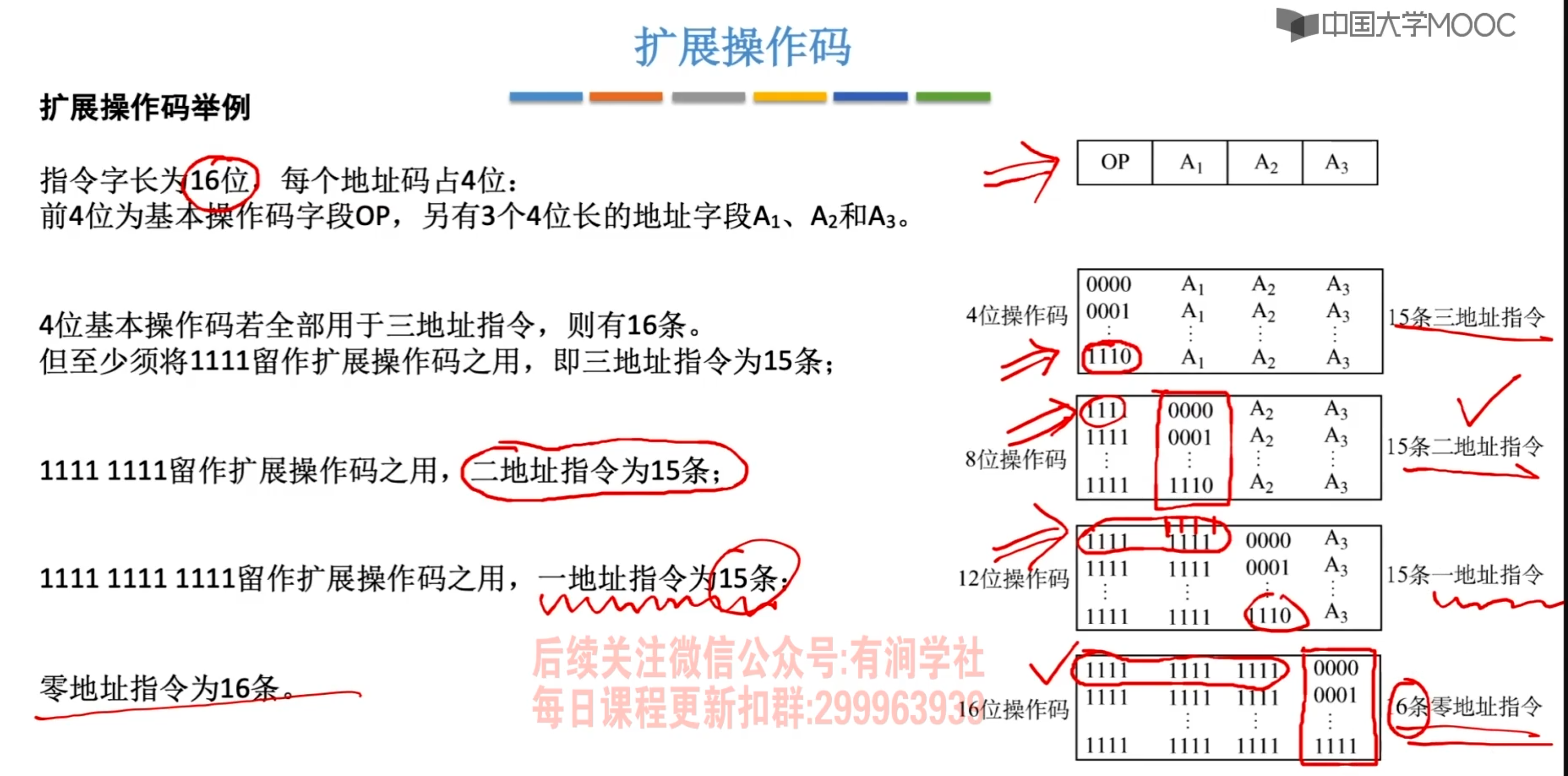 2.扩展码技术中,注意要去掉一种编码(比如1111)用于一地址指令扩展,所以二地址指令最多可以有15种操作指令。