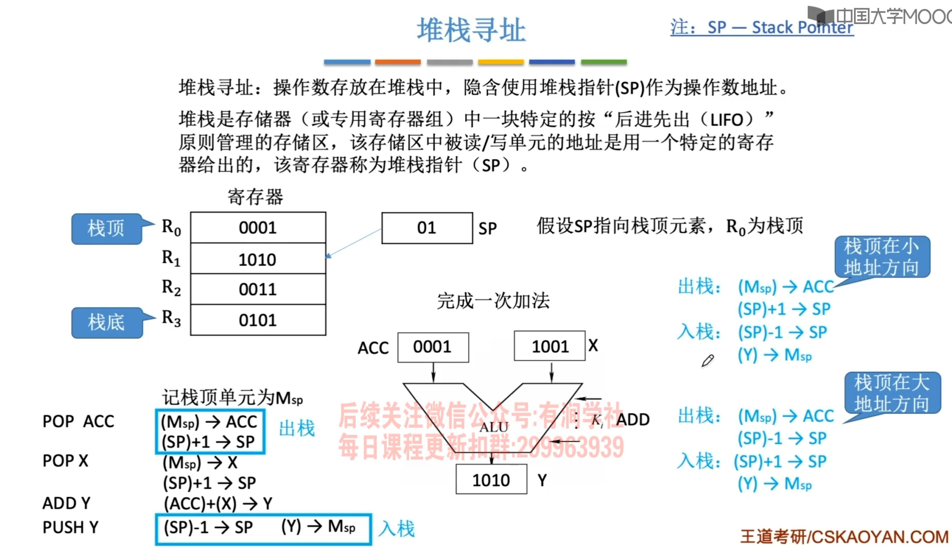 单地址指令中只有一个地址码,在完成两个操作数的算术运算时,一个操作数由地址码指出,另一个操作数通常存放在累加寄存器(ACC)中,属于隐含寻址。