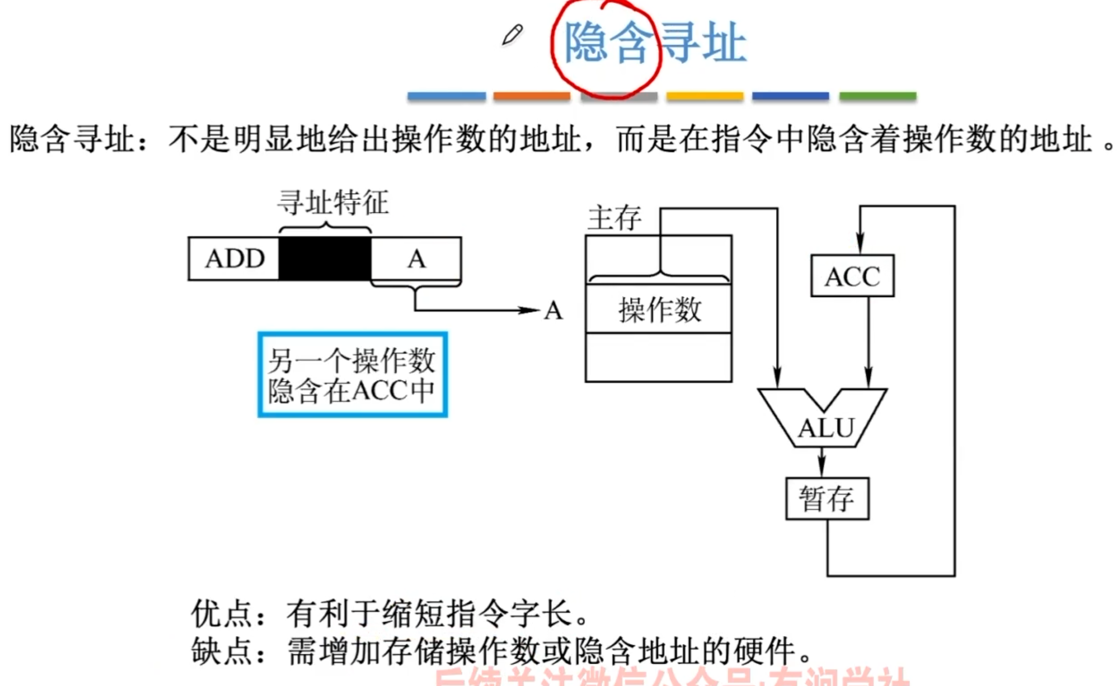 1.隐含寻址:优点是有利于缩短指令字长,缺点是需要增加存储操作数或隐含地址的硬件。