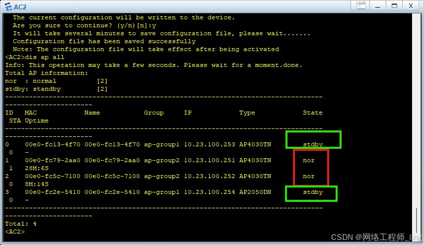 AC2上AP1 AP2为stdby备份状态、AP3 AP4为normal状态 AC2作为AP3 AP4的主用AC