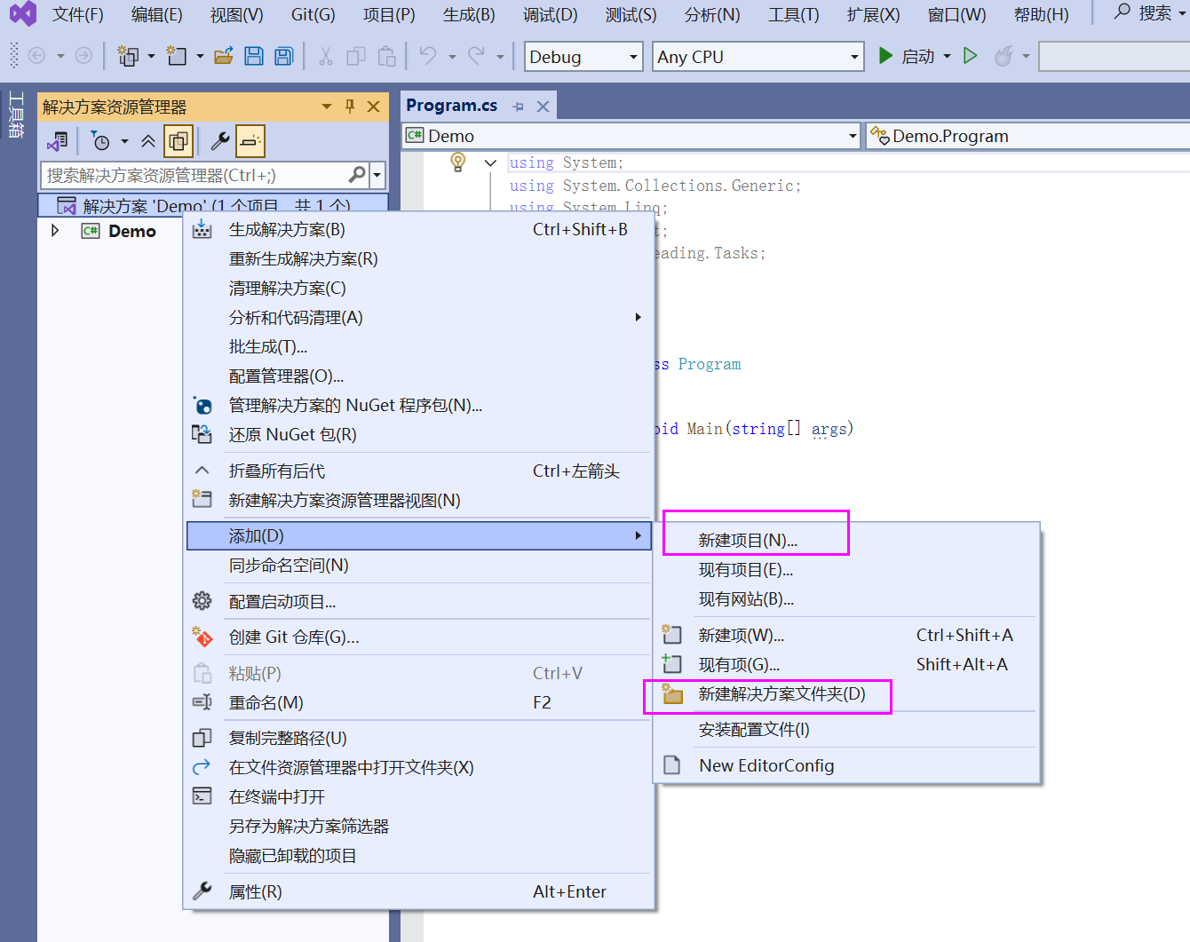 可以右键选择添加新建项目,或者新建文件夹,在文件夹内新建项目