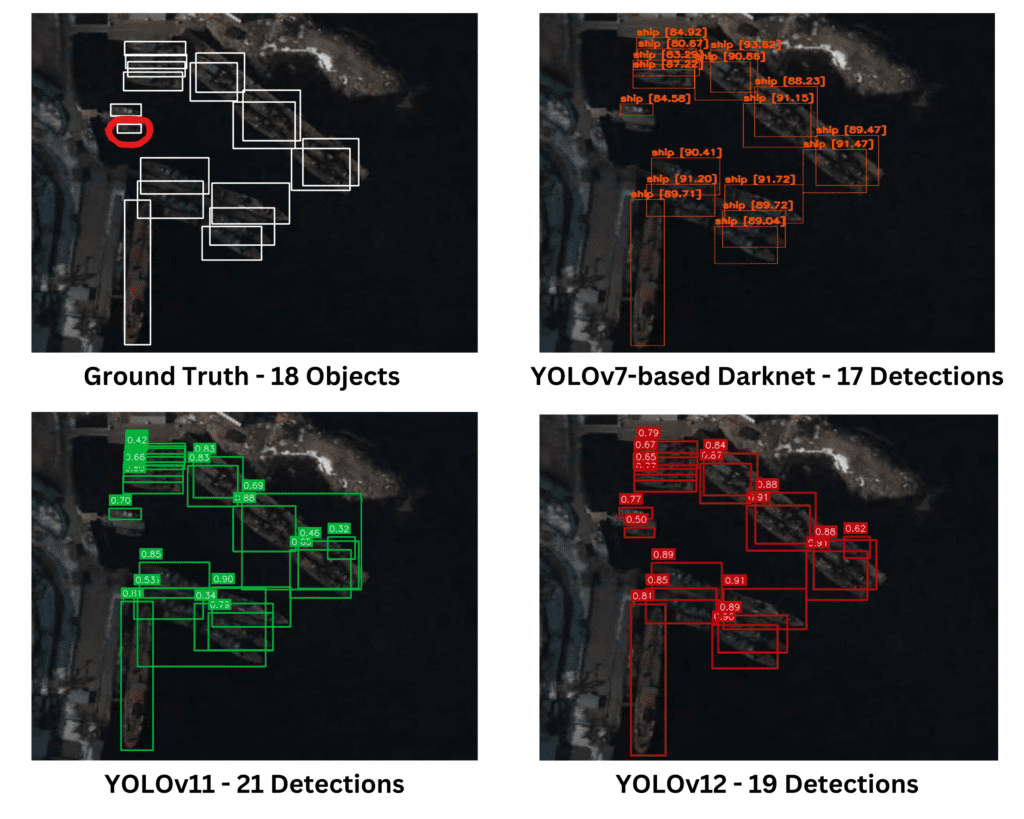 本研究对在 HRSC2016-MS 数据集上微调 YOLOv12、YOLOv11 和基于 Darknet 的 YOLOv7 进行了深入分析,重点关注提高航拍舰船图像中小目标的检测能力。原始数据集的洗牌和重新构建在提高模型性能方面发挥了关键作用,因为初始的训练 - 测试划分存在偏差,影响了泛化能力。