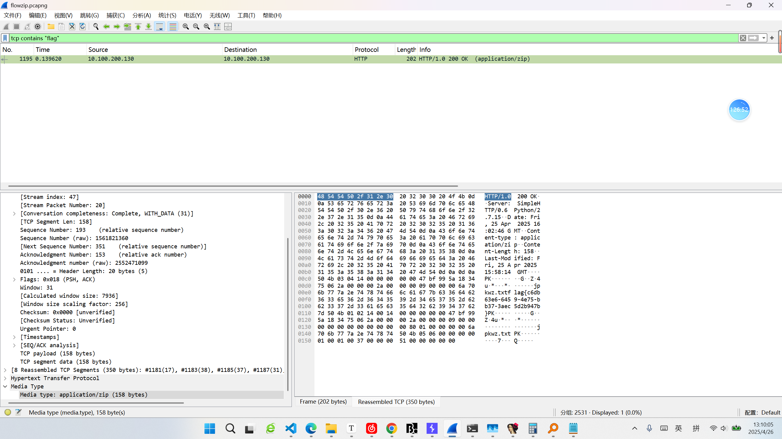wireshark 打开,过滤器设置为 tcp contains "flag":