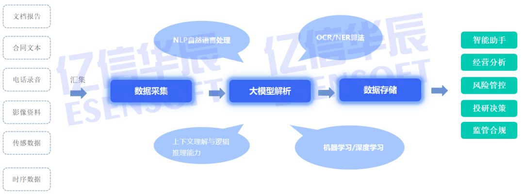 利用大模型的文本识别、分类标注技术,结合OCR、NER等算法实现图片、文档等非结构化数据的提取、加工和处理。从以往的只能面向数据库数据处理扩展为可面向多元化、多模态的数据处理,大大增强对数据的应用能力。